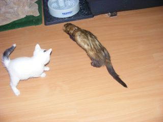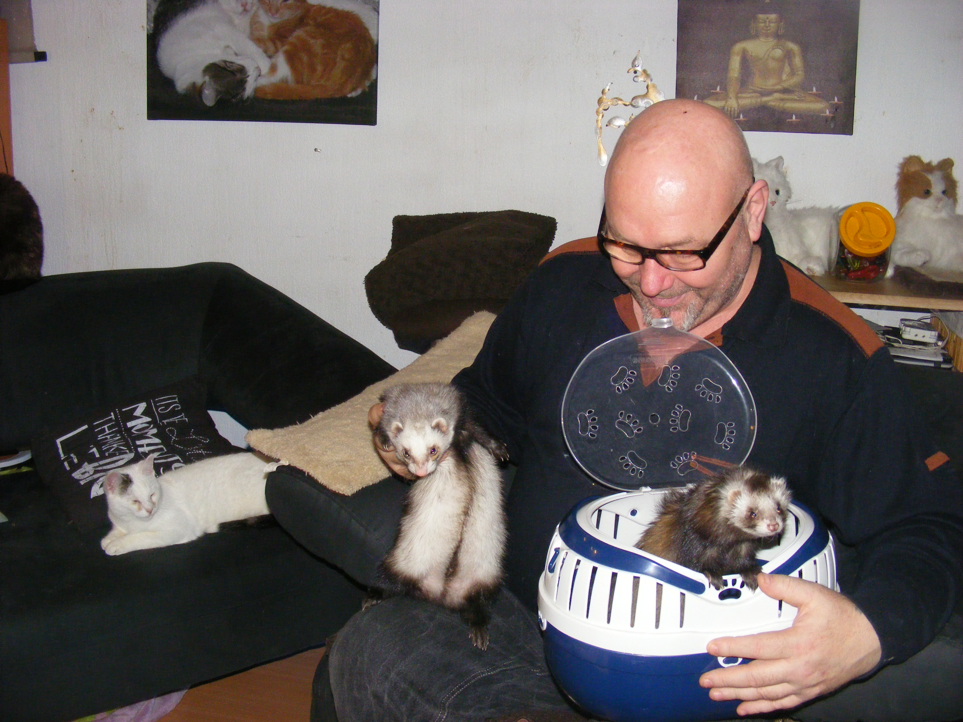 Ja en toen werd het weer heel spannend in onze clan, ik kreeg de vraag van mijn nichtje Tash of ik nog het angora fretje en haar vriendje een grote man wou hebben, ik was daar al van de zomer even mee bezig geweest, maar toen ging het verhaal niet door, nu zat de eigenaar van de twee fretjes met zijn handen in het haar, want ze stonden al een tijdje op marktplaats maar ze vonden geen goed adres voor ze. Ja snel even overleg met Rik gehouden, en besloten "laten we het maar proberen met ze hier"