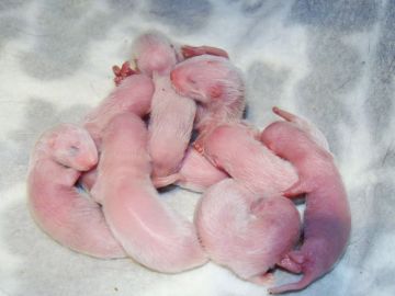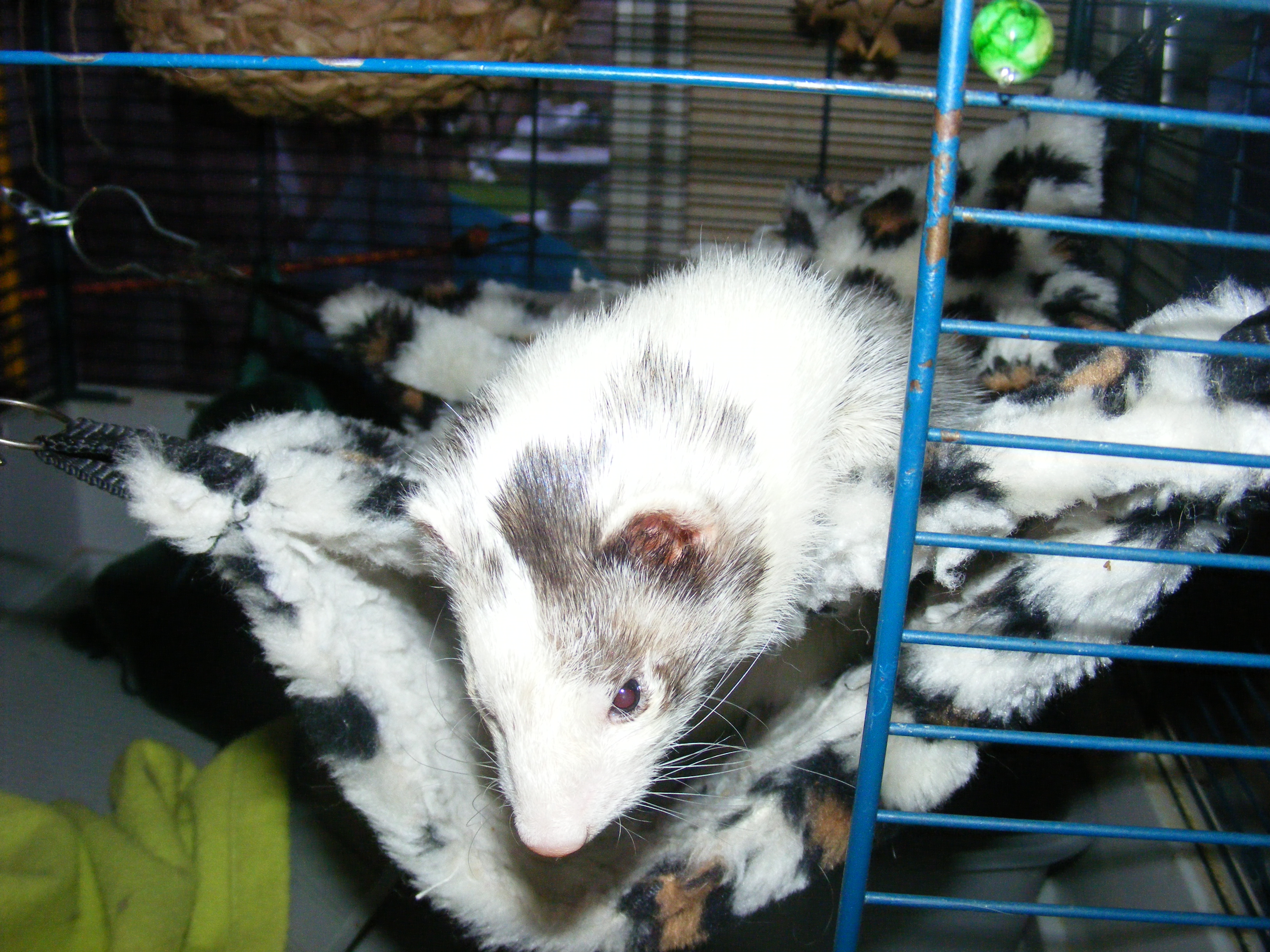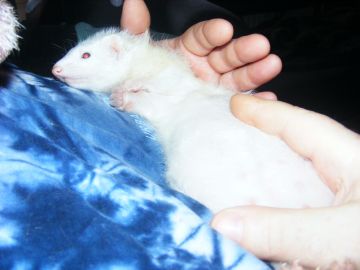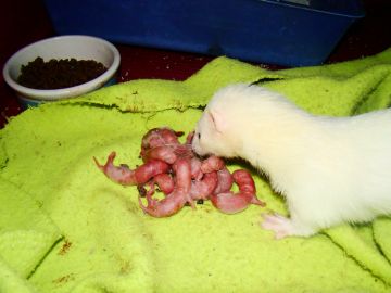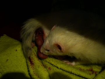 Tot nu toe was het een dame met een pittig karakter, en niet altijd lief tegen haar soort genootjes, plagen was haar liefste bezigheid, vooral onze lieve Albino man Jabba had daar last van. Van de andere kant zit ze normaal altijd met Zulu en Bommel in 1 kooi, en daar is ze de beste maatjes mee. Jammer genoeg werd Snowy vorig jaar niet loops, en dit jaar was er ook eigenlijk niks aan haar tezien(geen koffie boontje) maar heel vreemd, onze mannen roken toch echt iets anders, want toen ze in het buiten verblijf samen zaten was het raak, zowel onze Mazzel, als Stripe hebben haar gedekt, ja in het begin behoorlijk gegil, maar opeens ging haar boontje toch openstaan, dus heb het maar zo gelaten.Tijdens haar zwangerschap werd haar karakter ook opeens veel liever naar de andere fretten toe, Het was voor mij al vrij vlug duidelijk dat zij echt wel zwanger was, verloor heel veel haar, en haar buik werd maar dikker en dikker, ze was in totaal 220 gram bij gekomen.
