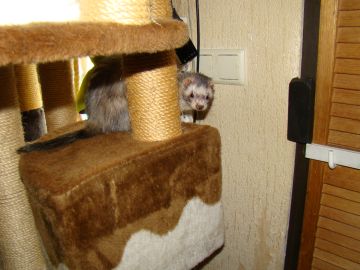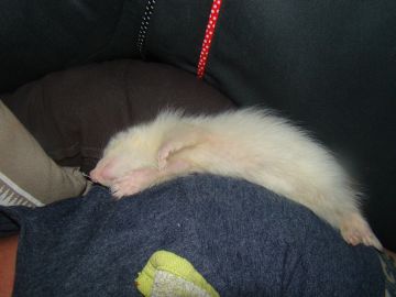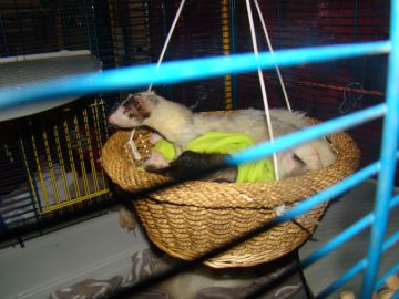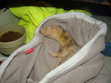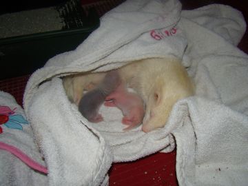 Gelukkig bleef zijn kleine zusje het goed doen, en hoe langer ik er over nadacht hoe duidelijker het verhaal voor me werd. Omdat Snowy absoluut niet kan opschieten met de andere fretten behalve de grote mannen Stripe en Mazzel, leek het me een goed idee om dit kleine meisje maar gewoon bij haar moeder te laten, zo dat mama Snowy niet meer alleen in haar kooi was, en Rik vond dat ook een goed idee, na even zoeken op Google had ik ook gelijk haar naam, en die is geworden Binti ( betekend op zijn Afrikaans dochter) dus heel toepasselijk.Het gaat heel goed zo samen, en als Binti teveel energie heeft en mama wil slapen mag ze lekker bij de 3 musketiertjes( Loki, Ava en Rivka) in de kooi spelen.