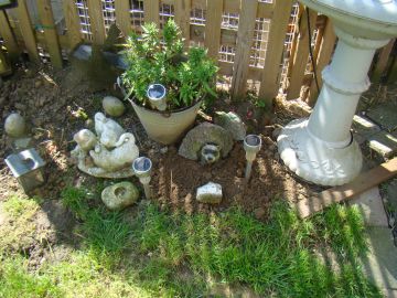 En natuurlijk heeft dit kleine manneke een mooi plekje in onze tuin gekregen bij zijn andere vriendjes